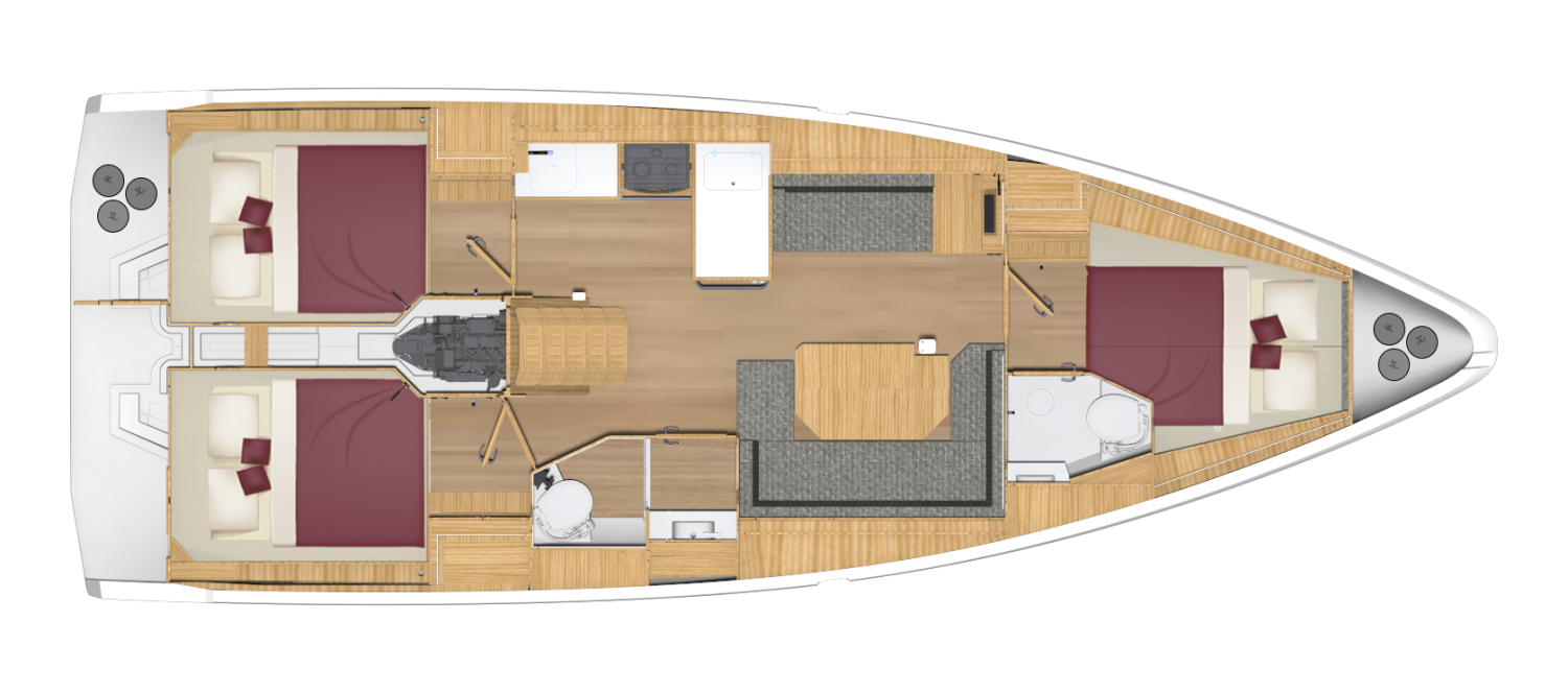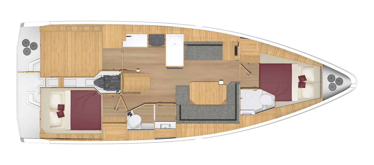 Foredeck and side decks offer you plenty of freedom of movement and thanks to the innovative hull design, new dimensions open up below deck as well. There is a choice of individual cabin layouts, from the luxurious 2-cabin version with one spacious bathroom to the comfortable 3-cabin version with two bathrooms. As the owner, you can dream in a real king-size bed in the forward cabin - comfortable headroom and plenty of daylight included.